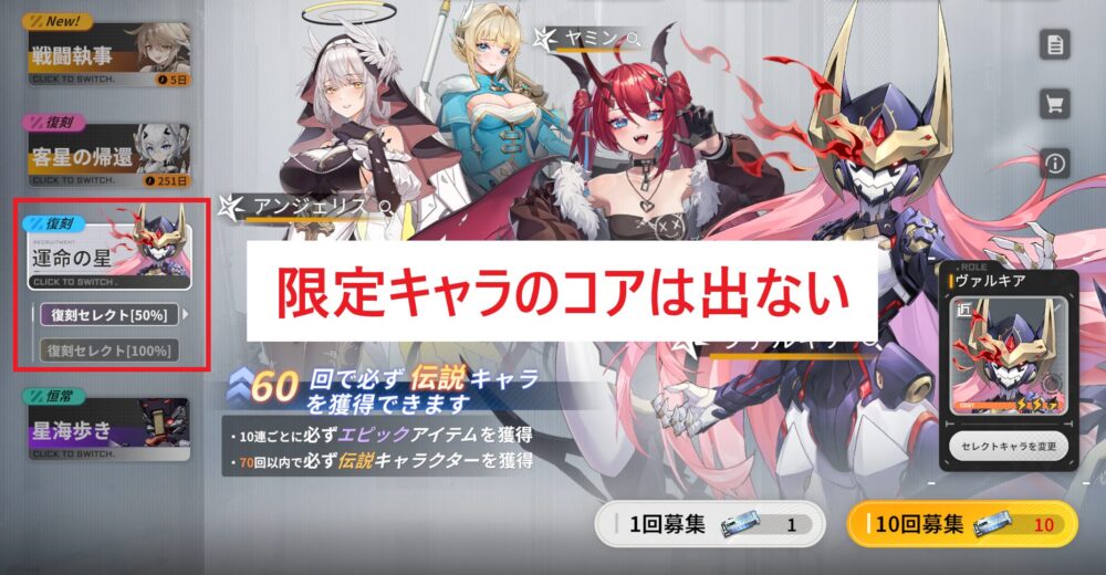 こちらは「そのキャラのピックアップガシャ」でのみコアが入手可能で「復刻ガシャ(運命の星)」に追加された後でもガシャからコアが出ることはありません。