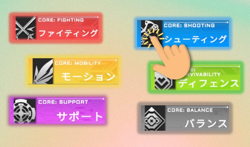 上で説明した「コア」には6つの種類があり、その中から1つ選んでキャラクターに装着します。
