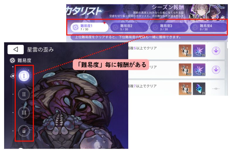 星雲の歪みには4段階の難易度が存在し難易度ごとに別途報酬が設定されています。