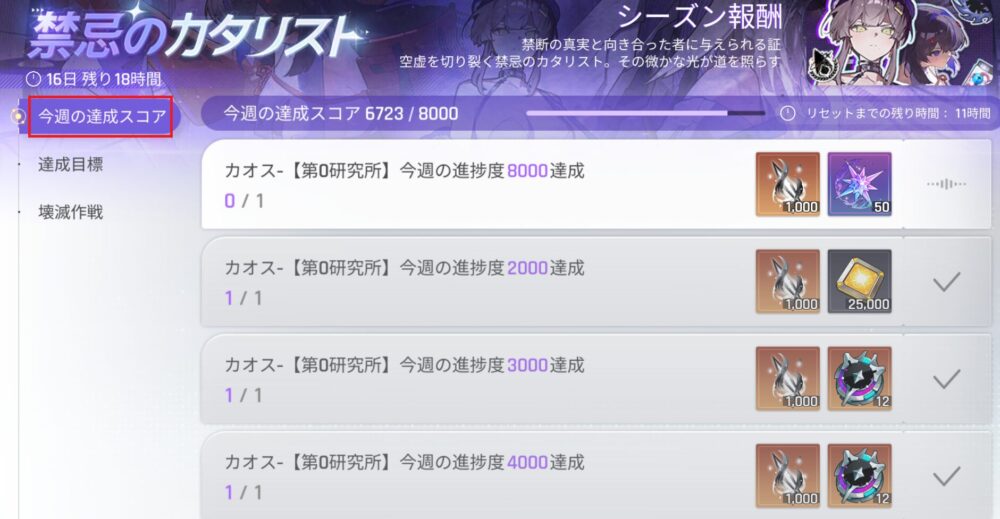 ちなみに「1回きりの報酬」「毎週の報酬」があるので、取り逃したくなければ毎週この「大亀裂」に挑む必要があります。