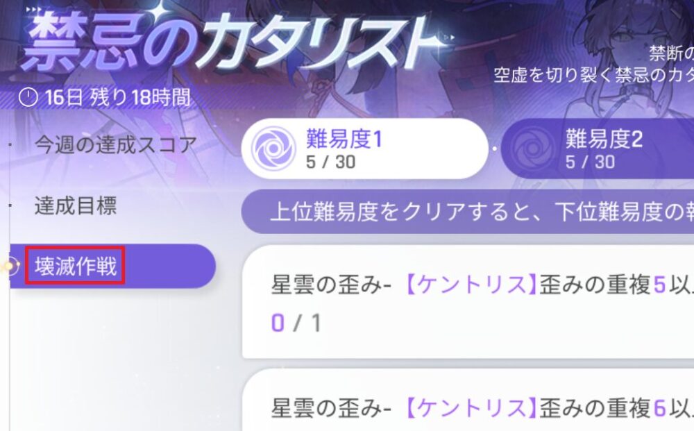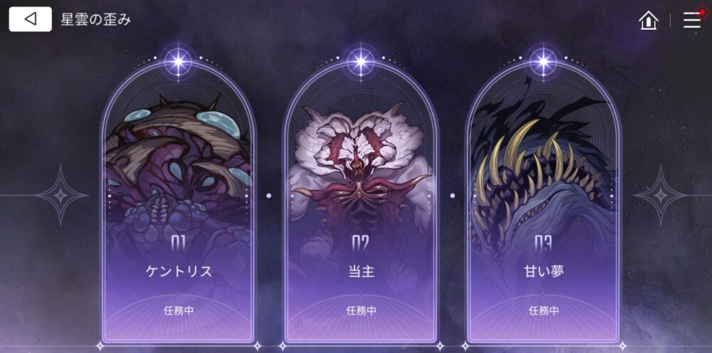 こちらは挑戦課題の内の「壊滅作戦」に対応したコンテンツで、内容は「星雲の歪み」という「選択したボスを倒す」という非常にシンプルなものです。