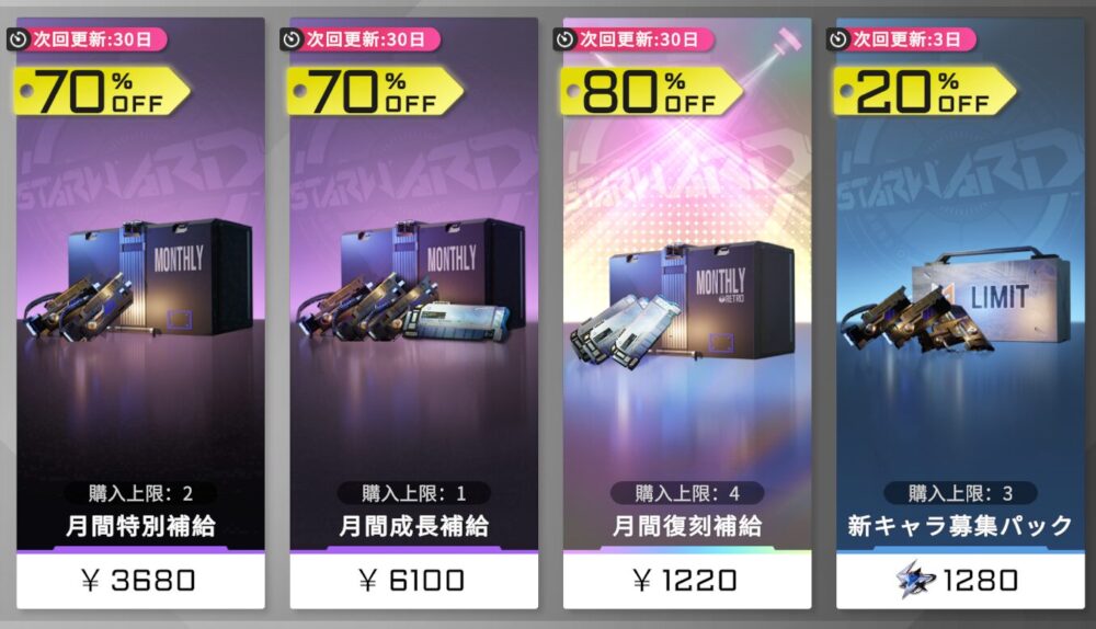 こちらは"毎週/毎月"購入可能回数がリセットされる、ガシャチケットなどのアイテムパックです。