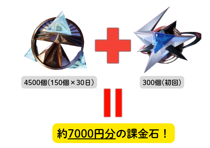 「月度補給契約」の値段は「月額610円」なのですが、30日分ちゃんとログインして回収しきると約7,000円分星晶/星石が獲得できます。1