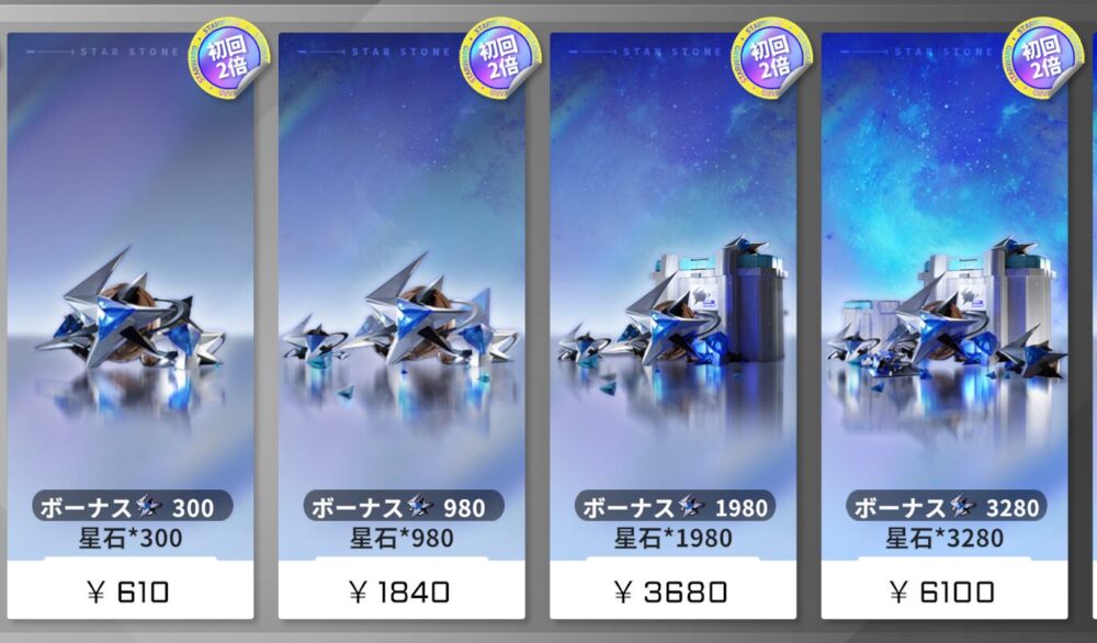 課金石である「星石」ですが、こちらは各パックが"初回に限り"2倍の数量獲得できます。